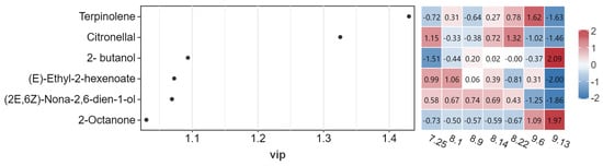 The value of VIP (variable important in projection) was the weight value of OPLS-DA model variables, which reflected the influence intensity of each variable on the sample. It was generally based on the VIP value of >1. The data of flavor compounds with a p-value < 0.05 and OAV value > 1 were further quantified in Schisandra chinensis fruit at seven stages, and OPLS-DA analysis was performed as a variable to accurately screen out the VIP value > 1 substance as the key volatile flavor substance of Schisandra chinensis. The results are shown in Figure 8. A total of six volatile flavor substances that contributed more to Schisandra chinensis were screened: terpinolene, citronellal, 2-butanol, (E)-ethyl-2-hexenoate, (2E,6Z)-Nona-2,6-dien-1-ol, and 2-octanone, which may be markers of the distinctive flavor of Schisandra chinensis fruit. Among them, terpinolene with the highest VIP value was one of the key markers that caused the aroma characteristics of Schisandra chinensis fruit in different harvesting periods.