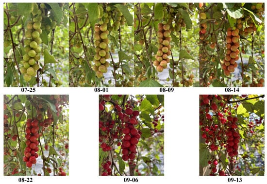 ‘Yanzhihong’, a new variety approved by the Specialty Research Institute of the Chinese Academy of Agricultural Sciences, was obtained from the National Forest Germplasm Resource Bank of Schisandra chinensis (Figure 9). Schisandra chinensis was planted in 2019, with a total of 6 trees of consistent age. The harvest period was from July to September 2022, and the fruit was picked once every seven days from the color transformation stage to the fruit maturity stage. Seven periods were selected: 07–25, 08–01, 08–09, 08–14, 08–22, 09–06, 09–13. Fruit trees that showed good growth in the resource nursery were randomly selected, and 50 Schisandra chinensis fruits with uniform size and free from pests and diseases were also chosen. After being dried to constant weight, they were used to determine the indexes of Schisandra chinensis.