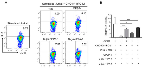 In the coculture experiment, Jurkat cells were stimulated with 12-myristic ester-13-acetate (PMA, 25 ng/mL) and phytohemagglutinin (PHA, 1 μg/mL) and cocultured with CHO-K1-hPD-L1 cells. Then, the cells were treated with 100 μM D-gal-LPPA-1 for 4 h. Then, 1 μL of protein transport inhibitor was added, and the coculture was incubated for 48 h. The cells were subsequently collected and incubated on ice for 30 min upon the addition of an anti-human CD45 FITC antibody. The cells were then fixed with 4% paraformaldehyde and incubated with anti-human-IL-2-APC (MQ1-17H12; eBioscience, San Diego, CA, USA) for 30 min. Flow cytometry was used for detection and analysis [37].
