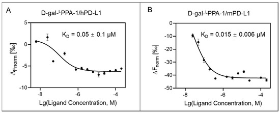 Dose-dependent binding curve of D-gal-LPPA-1 with PD-L1 determined by MST. Similar results were observed in triplicate. (A) The concentration-response curve of D-gal-LPPA-1 with hPD-L1. (B) The concentration-response curve of D-gal-LPPA-1 with mPD-L1. The data are presented as the means ± SEMs. The bars indicate the standard error of the mean of triplicate samples.