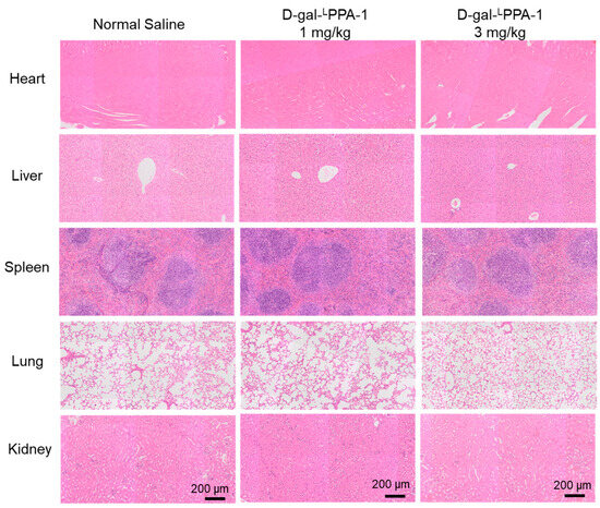 H&E staining of various organs of mice treated with the peptide D-gal-LPPA-1 (1 mg/kg), D-gal-LPPA-1 (3 mg/kg), or the negative control normal saline. Scale bar: 200 μm.
