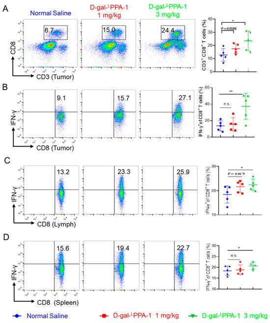 D-gal-LPPA-1 significantly enhanced the functionality of CD8+ T cells in MC38 tumor-bearing mice. (A) The proportion of CD8+ T cells that infiltrated the tumor. (B–D) The proportions of IFNγ+CD8+ T cells detected by intracellular cytokine staining in cell suspensions from (B) tumor tissues, (C) draining lymph nodes, and (D) spleens. (n = 5, mean ± SEM). n.s., not significant; * p < 0.05; ** p < 0.01.