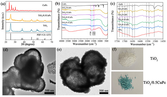 (a) XRD patterns of TiO2, CuPc, and TiO2/0.5CuPc. FTIR spectra at (b) 400–4000 cm−1 and (c) 1450–1750 cm−1 of TiO2, CuPc, and TiO2/xCuPc. TEM images of (d) TiO2 and (e) TiO2/0.5CuPc. (f) Photographs of TiO2 and TiO2/0.5CuPc.