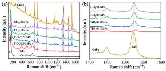 Raman spectroscopy was utilized to further investigate the structures of TiO2 and TiO2/xCuPc. As expected, the Raman spectra prove that the TiO2 microspheres exhibited an anatase phase (Figure 2a). The characteristic peaks at 146, 396, 516, and 637 cm−1 are assigned to the Eg(1), B1g, A1g, and Eg(3) lattice vibration modes of the anatase phase, respectively [32]. The Raman spectra of TiO2/xCuPc show both TiO2 and CuPc characteristic peaks, indicating that the TiO2/xCuPc heterojunctions were successfully synthesized. It was observed that the intensity of the characteristic peaks of CuPc gradually increased with the increase in the amount of CuPc modification, while the intensity of the characteristic peaks of TiO2 gradually decreased. In addition, the Raman vibration peak at 1523 cm−1 (the tensile of C-N-C bridge bonds in the CuPc) was shifted towards the long-wave-number direction after the formation of TiO2/xCuPc heterojunctions, which may have been due to the occurrence of a self-assembly of CuPc on the TiO2 surface (Figure 2b) [33,34].