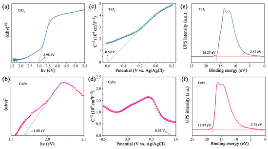 The optical band gap of a catalyst can be calculated from its light absorption spectra according to the equation αhv = A(hv − Eg)n/2, where α, h, ν, A, and Eg represent the absorption coefficient, Planck constant, light frequency, proportionality, and band gap energy, respectively. For TiO2 and CuPc, the values of n are 1 and 4, respectively. Based on the above equation, the calculated Eg values for TiO2 and CuPc are 2.98 and 1.68 eV, respectively (Figure 4a,b). To further investigate the band structures of TiO2 and CuPc, Mott–Schottky curves were obtained. A positive slope of the Mott–Schottky plot would indicate that TiO2 is an n-type semiconductor, while a negative slope of the Mott–Schottky plot would indicate that CuPc is a p-type semiconductor. As shown in Figure 4c,d, the flat band potentials of TiO2 and CuPc were determined to be −0.59 V and 0.92 V vs. Ag/AgCl, respectively. According to the formula E(RHE) = E(Ag/AgCl) + 0.197 + 0.059 pH, we could deduce that the conduction band potential (ECB) of TiO2 and the highest occupied molecular orbital (HOMO) energy level of CuPc were approximately 0.01 and 1.52 V vs. RHE, respectively. According to the empirical equation Eg = EVB − ECB, the valence band potential (EVB) of TiO2 and the lowest unoccupied molecular orbital (LUMO) energy level of CuPc were calculated to be 2.99 and −0.16 V vs. RHE, respectively. In addition, ultraviolet photoelectron spectroscopy (UPS) was also performed to determine the valence band energy (EVB) of TiO2 and CuPc (Figure 4e,f). The incident photon energy (hv) of the helium I source was 21.22 eV [36,37]. By subtracting the width of the peak from the excitation energy (21.22 eV), the valence band maximum of TiO2 and the HOMO energy of CuPc were calculated to be 7.52 and 5.98 eV, respectively, on the absolute vacuum scale (AVS). According to the reference standard, 0 V for the reversible hydrogen electrode (RHE) is equal to 4.44 eV on the vacuum level. Therefore, the EVB (versus RHE) value of TiO2 and the HOMO energy of CuPc were calculated to be 3.08 and 1.54 V, respectively. That is, the conduction band energy (ECB) of TiO2 and the LUMO energy of CuPc were 0.10 and −0.14 V, respectively. These results are consistent with those found in the Mott–Schottky plot calculations.