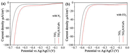 Electrochemical reduction curves of the TiO2 and TiO2/0.5CuPc heterojunction in (a) a N2-bubbled system and (b) a CO2-bubbled system, respectively.