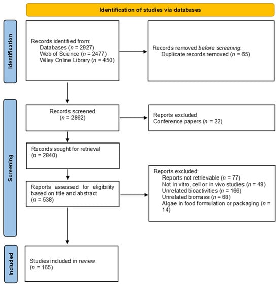 A total of 2927 studies were screened in the initial electronic search; 65 duplicated studies were found as well as 22 conference papers, which were both disregarded. After screening the titles and abstracts, 538 studies were considered suitable for retrieval, due to fulfilling the inclusion criteria. However, 77 papers could not be retrieved by EndNote (n = 461). After reviewing full-text articles, 296 were excluded for the following reasons: studies regarding bioactivities not relevant to the scope of this review (animal/plant, immunomodulatory, neurological, bone-related, or eye health) (n = 166), studies on food formulation and/or packaging including algae biomass, which did not contain relevant information for this review (n = 14), studies on biomasses other than marine algae or marine algae-derived compounds (n = 68), and studies presenting only in chemico results (n = 48). After this process, 165 studies were considered eligible for the review. Of the studies included in this review, a total of 72 had cell-based results and 32 studies were included by presenting in vitro results. Additionally, 61 in vivo studies showed the effects of marine algae compounds with several health-related bioactivities on humans, kittens, dogs, rats, mice, and zebrafish. When studies included more than one bioactivity, the study was only included in the section where the results were more significant. If several treatment models were tested, only the results from the higher model were included in the review, to avoid repetition. A flow diagram of the article selection process is shown in Figure 1.