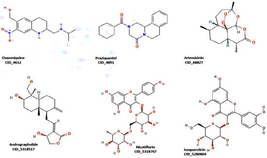 The three reference ligands, Oxamniquine, Praziquantel, and Artemisinin, and identified ligands (Andrographolide, Nicotiflorin, and Isoquercitrin).