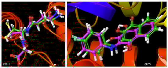 The superimposed structures of the co-crystalised ligands in their co-crystallised (magenta) and re-docked poses (green) [RMSD = 0.73 and 0.87 A for 2X8H and 6UY4, respectively].