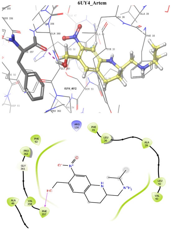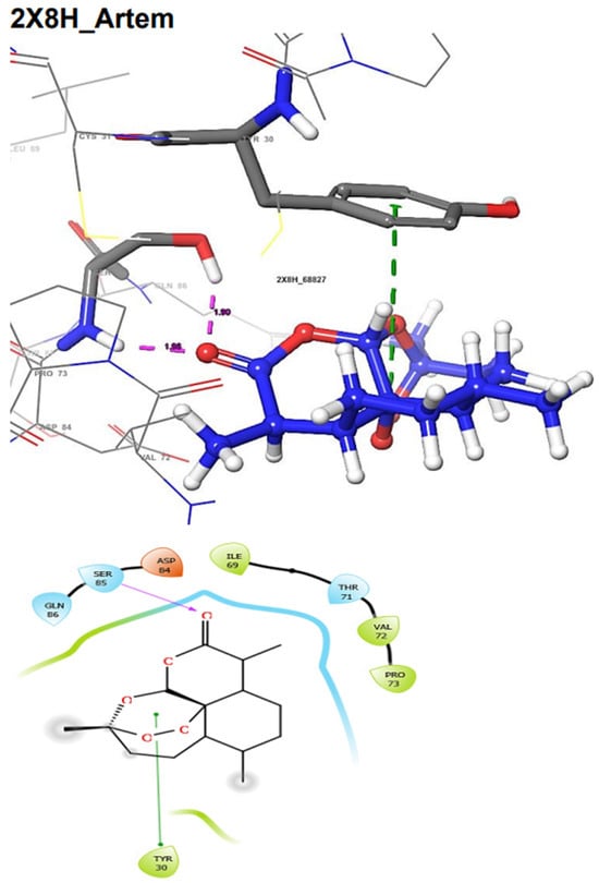 The 3D (top) and 2D (bottom) ligand interactions of the Artemisinin–Schistosoma mansoni dihydroorotate dehydrogenase complex. The binding site residues’ charges are indicated in the 2D image by the colours red for negative, blue for positive, and white for neutral.