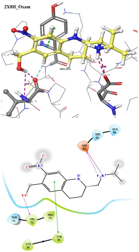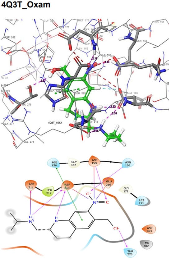 The 3D (top) and 2D (bottom) ligand interactions of the Oxamniquine–Schistosoma mansoni Arginase complex. The binding site residues’ charges are indicated in the 2D image by the colours red for negative, blue for positive, and white for neutral.