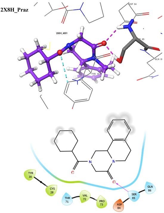 The 3D (top) and 2D (bottom) ligand interactions of the Praziquantel–thioredoxin glutathione reductase complex. The binding site residues’ charges are indicated in the 2D image by the colours red for negative, blue for positive, and white for neutral.