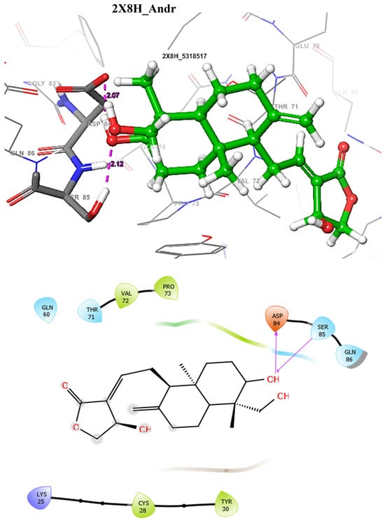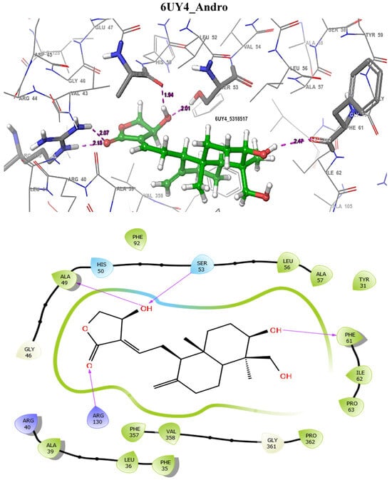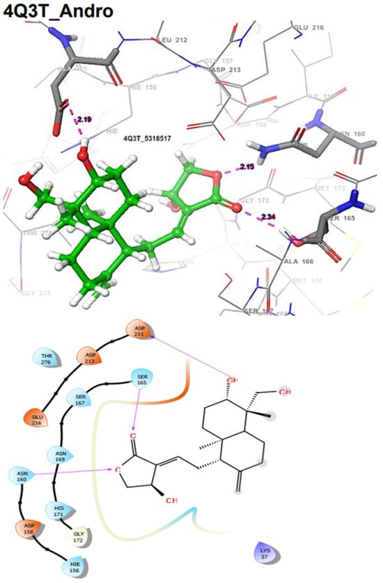 The 3D (top) and 2D (bottom) ligand interactions of the Andrographolide–Schistosoma mansoni dihydroorotate dehydrogenase complex. The binding site residues’ charges are indicated in the 2D image by the colours red for negative, blue for positive, and white for neutral.