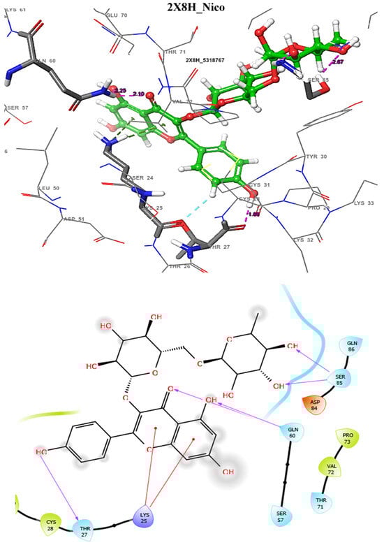 The 3D (top) and 2D (bottom) ligand interactions of the Nicotiflorin–thioredoxin glutathione reductase complex. The binding site residues’ charges are indicated in the 2D image by the colours red for negative, blue for positive, and white for neutral.