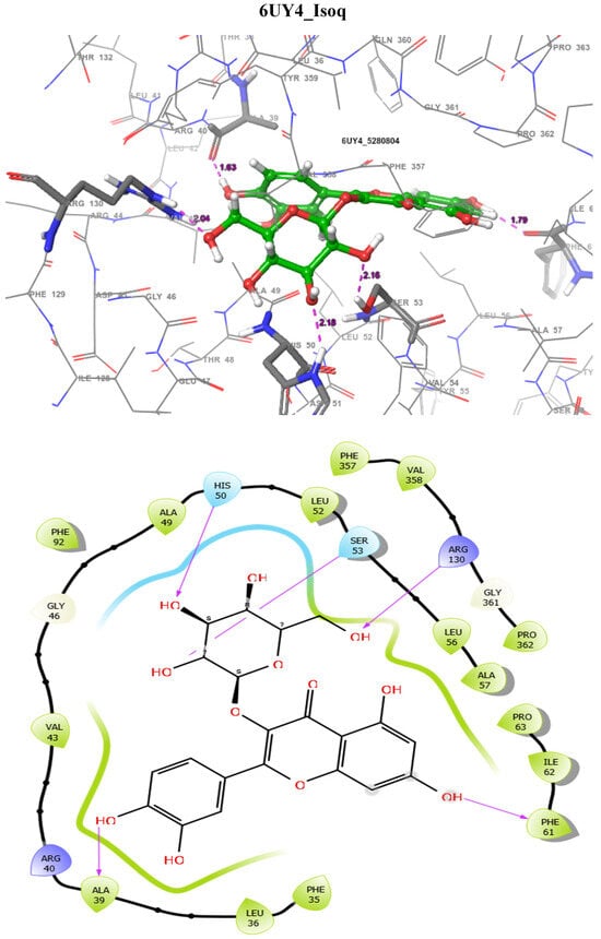The 3D (top) and 2D (bottom) ligand interactions of the Isoquercitrin–Schistosoma mansoni dihydroorotate dehydrogenase complex. The binding site residues’ charges are indicated in the 2D image by the colours red for negative, blue for positive, and white for neutral.