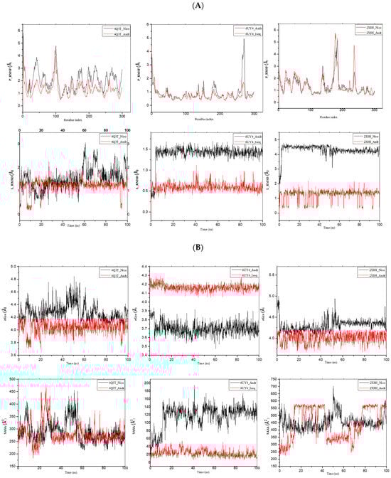 MD simulation of 4Q3T, 6UY4, and 2X8H complexed to 5318517: Andrographolide, 5318767: Nicotiflorin, and 5280804: Isoquercitrin. (A) RMSF and RMSD graphical illustration plot. (B) rGyr representation and SASA diagram. All simulations were carried out using Schrödinger’s Maestro suite.