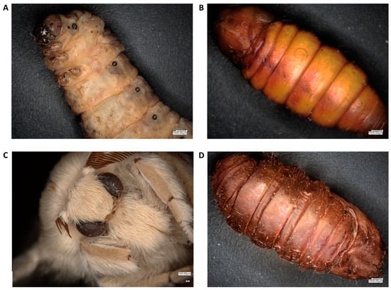 Optical microscope images of mulberry silkworm stages and appendage of the pupa used for chitin extraction, respectively: (A) larval stage, (B) cocoon (C) imago and, additionally, (D) remnant of the pupa.