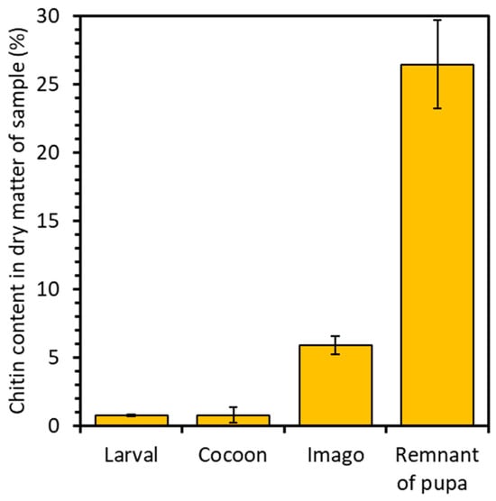 The analysis revealed distinct chitin content variations across the developmental stages and remnant of the pupa of the mulberry silkworm. For the larval stage, 0.7% chitin content was attained, while for the cocoon, it reached 0.8%, and for the imago, it amounted to 5.9% in dry matter. Notably, the pupal residue exhibited the highest chitin content, reaching 26.5% (Figure 2). This significant disparity in chitin levels underscores the pivotal role of chitin as a primary constituent in forming protective shells. These shells act as crucial barriers, safeguarding the delicate internal structures of the pupa from external influences. Consequently, the heightened chitin content within the pupal stage reflects the increased demand for chitin in constructing and reinforcing these vital structures. Such insights illuminate the dynamic interplay between chitin utilization and developmental requirements throughout the silkworm life cycle. A study conducted by P. Battampara et al. [31] demonstrated that employing the processes of deproteinization, decolorization, and demineralization enabled the isolation of 18% chitin content in the dry matter derived from Silkworm pupa. In contrast, the research conducted by A.T. Paulino et al. [40] demonstrates the isolation of 2.59–4.23% chitin from silkworm chrysalides. Comparing these findings with our own results, it is evident that the methodology employed facilitated the extraction of a greater quantity of chitin, with the remnants of the pupae exhibiting the highest chitin content.