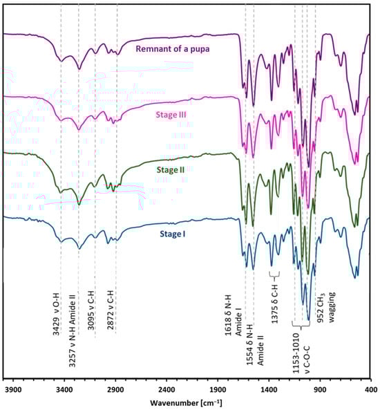 The ATR-FTIR spectra were obtained for the respective developmental stages of the mulberry silkworm: Stage I—larval stage, Stage II—cocoon, Stage III—imago form, and remnant of a pupa.