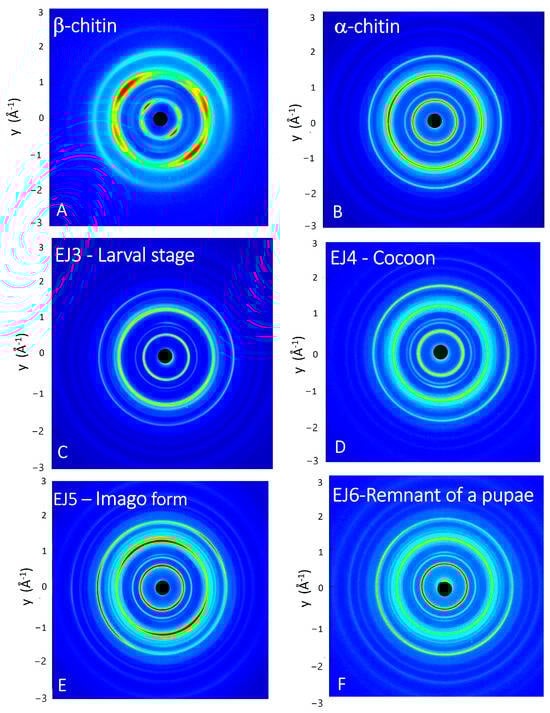 Two-dimensional WAXS patterns of the following: (A) β-chitin standard sample, (B) α-chitin standard sample, (C) larval stage, (D) cocoon, (E) imago form and (F) remnant of a pupa.