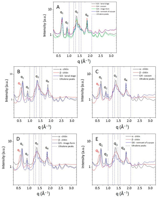 One-dimensional WAXS profiles of (A) α- and β-chitin standard samples (red and blue curve, respectively). (B–D) show a comparison between the 1D profiles of α- and β-chitin reference samples and the ones collected from respective developmental stages (larval, cocoon, imago) and (E) remnant of a pupa.