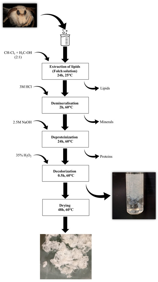 The specific developmental stages of the mulberry silkworm and remnant of the pupa come from the only Polish silkworm farm run by the Institute of Natural Fibers and Medicinal Plants in Poznań, a National Research Institute. The compounds used during chitin extraction (Figure 8), namely chloroform (≥99.9%), methanol (≥99.9%), sodium hydroxide (≥98%), hydrochloric acid (37%), and hydrogen peroxide (35%), were purchased from Merck KgaA (Darmstadt, Germany). Distilled water was used to prepare every solution utilized during the tests.