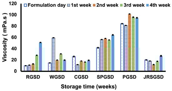 Viscosity of the GSD-stabilized soybean O/W emulsions during four weeks of storage at 25 °C.