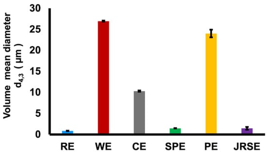 Volume mean diameter (d4,3) and Zeta potential of the GSD stabilized soybean oil-in-water (O/W) emulsions. RE: indica rice GSD stabilized (O/W) emulsion, WE: Wheat GSD stabilized (O/W) emulsion, CE: Corn GSD stabilized (O/W) emulsion, SPE: Sweet potato GSD stabilized (O/W) emulsion, PE: Potato GSD stabilized (O/W) emulsion, JRSE: japonica rice GSD stabilized (O/W) emulsion.