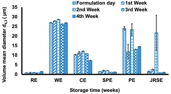 Volume mean diameter (d4,3) of the GSD-stabilized soybean O/W emulsions during four weeks of storage at 25 °C.