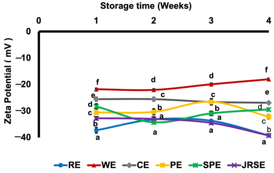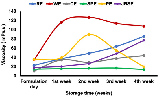 At 25 °C storage for four weeks, both RE and JRSE emulsions, with a d4,3 of approximately 1 μm (Figure 5), exhibited the highest stability. The viscosity increase fell within a suitable range, preventing the movement of oil droplets and their coalescence (Figure 6). Additionally, the ζ-potential (Figure 7) remained consistent at around −39.2 and −34.9 ± 0.45 mV, suggesting the maintenance of weak steric repulsion, which plays a crucial role in stability during storage, and the emulsions showed minimal creaming (Figure S10a,b). The increase in viscosity is due to the gelling and pasting properties of starch polysaccharides, breakdown of crystalline structures, and leaching of amylose, which are largely dependent on the molecular weight of starch. This observation was consistent with the findings of prior research [17]. CE was observed to be the third most stable (Figure S10b), with a d4,3 of approximately 10 μm. Similar to the above cases, the viscosity increase was within a suitable range. Additionally, it exhibited minimal creaming. However, the ζ-potential remained within a narrow range (−26.9 ± 0.26 mV) throughout the storage period. The least stable emulsions were the WE, SPE, and PE. Viscosity increased for two weeks and then decreased for WE and PE, possibly owing to the initiation of retrogradation because of their largest d4,3 among all the GSDs, whereas for SPE, no change in viscosity was observed, and its viscosity was the lowest among all the emulsions, possibly owing to certain physicochemical properties arising from the small d4,3 of SPGSD and its higher amylopectin content. The creaming phenomenon is due to the upward movement of dispersed phase droplets in emulsions during storage, and a cream layer is observed which indicates instability. No creaming was observed for RE, JRSE, and CE. Creaming indexes were observed to be 17.88 ± 0.71% for WE, 18.46 ± 0.88% for SPE, and 55.9 ± 1.75% for PE (Figure S10b), possibly due to their larger particle sizes (WE; d4,3: ~26 μm, PE; d4,3: ~14 μm), which can be attributed to the larger d4,3 of their respective GSDs used in emulsification. Although the d4,3 of SPE was rather small (~2 μm), it is likely that the higher amylopectin content in potato and sweet potato accelerated the retrogradation rate in the emulsions formulated with PGSD and SPGSD, resulting in creaming [21]. These three emulsions exhibited the lowest ζ-potential. For WE, ζ-potential reduced during storage, whereas for PE and SPE, ζ- potential (−29.4 ± 0.62 mV and −32.2 ± 0.25 mV, respectively) was maintained during the storage period. Optical micrographs (Figure 8) for all the freshly prepared emulsions show that dispersed phase droplets are well coated with GSDs and emulsion droplets are uniformly distributed. Creaming and oiling off were observed in the PE after four weeks of storage at 25 °C. A possible reason for this is the larger d4,3 of PE and the polysaccharide content of the corresponding GSD.