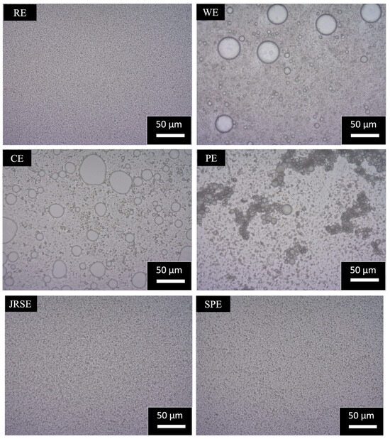 For emulsions stored at low temperature (5 °C) for four weeks, all emulsions exhibited stable visual appearance, with no creaming. The ζ-potential was maintained during storage, thereby stabilizing the emulsions (Figure S6). The viscosity change was the lowest for RE, JRSE, and PE, whereas it increased exponentially for the remaining emulsions (Figure S7). The d4,3 values for RE were the smallest during storage, whereas d4,3 of WE, SPE, and JRSE increased for three weeks and then decreased in the fourth week (Figure S8). Although creaming was not observed in any emulsion, PE underwent phase separation as it oiled off. According to a previous study [22], proteins can form complexes with starch that inhibit retrogradation during refrigerated storage. Therefore, traces of protein present in starch GSDs might have a role in emulsion stability at 5 °C storage. Optical micrographs (Figure S9) showed that the dispersed-phase droplets were well coated with GSDs, and the emulsion droplets were uniformly distributed even after four weeks of storage.