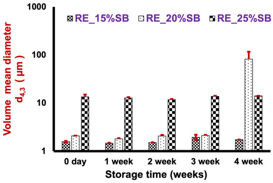 To investigate the emulsifying capability of RGSD, emulsions with higher weight fractions of soybean oil (15%, 20%, and 25% w/w) were formulated. RGSD was selected out of the six starches since the emulsions formulated with it exhibited the smallest particle size, fell within the optimum viscosity range, maintained a consistent surface ζ-potential, and showed the least creaming during storage at different temperatures. Emulsions containing 15% (w/w) soybean oil remained stable with a d4,3 of 1.57 μm (Figure 9), and least creaming was observed after four weeks of storage. In contrast, in 25% oil weight fraction emulsion, an increased d4,3 of 14.14 μm and creaming and oiling-off were observed (Figure S15). These findings align with those of a previous study [6], wherein a linear decrease in the stability of oil-in-water (O/W) emulsions was observed with an increase in both the volume of the oil phase and d4,3 function. The increase in the d4,3 value can be attributed to starch retrogradation in the continuous phase. In addition, the GSD particles in the continuous phase were not sufficient to coat the increasing concentration of the oil phase; therefore, the free oil droplets coalesced to form larger droplets. As a result, the stability decreased with increasing oil weight fractions, as is evident from the optical micrographs (Figure S15). The viscosity of indica rice GSD stabilized 15% soybean oil-in-water emulsion (RE_SB15%) and indica rice GSD stabilized 20% soybean oil-in-water emulsion (RE_SB20%) increased for the first two weeks and then decreased in the subsequent two weeks during storage at 25 °C, whereas for indica rice GSD stabilized 25% soybean oil-in-water emulsion (RE_SB25%), viscosity increased exponentially in the first week and then decreased (Figure S16). ζ-potential showed a decreasing trend after the second week, possibly due to lesser concentrations of GSDs with increasing oil weight concentration in emulsions, thereby reducing the ionic groups of GSDs responsible for electrical conductivity (Figure S17).