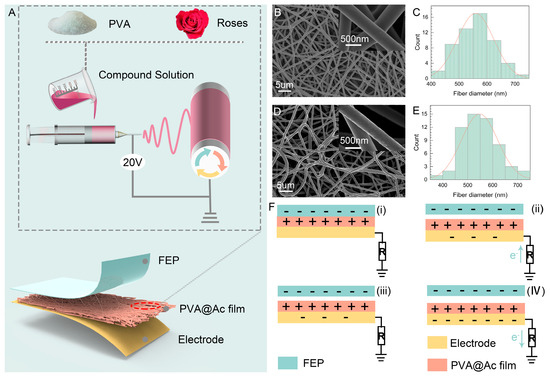 Herein, we propose a simple and easily scalable method for preparing pH-sensitive triboelectric nanogenerators (pH-TENGs). As shown in Figure 1A, the pH-TENG was prepared through the electrostatic spinning of a mixture of PVA and anthocyanin. PVA was dissolved in water to obtain a clear and viscous solution. Then, rose anthocyanin extract was added and stirred to obtain a red composite solution. Under the high-voltage electric, the mixed solution was transformed into the nanofiber film. Subsequently, to prepare pH-TENG with superior performance, the fiber films were chemically crosslinked to enhance their water resistance, pH sensitivity, and environmental friendliness. This process is mainly a reaction between PVA and glutaraldehyde (GA), including intramolecular and/or intermolecular crosslinking. Specifically, there is a condensation reaction between the hydroxyl groups in PVA and the difunctional aldehyde molecules in GA to form an aldehyde bridge (as shown in Figure S1) [42]. Within the 3075–3660 cm−1 range, a peak corresponding to the vibrational modes of hydroxyl groups in intramolecular and intermolecular hydrogen bonds was observed. The peak intensity of crosslinked PVA was lower than that of pure PVA, which can be attributed to the reaction between some hydroxyl groups of pure PVA and glutaraldehyde, thus furnishing the direct evidence of crosslinking within the PVA (Figure S2) [43]. As illustrated in Figure 1B,C and Supplementary Figure S3A, the SEM observations demonstrate that nanofiber films derived from various treatment groups, including pure PVA, crosslinked PVA, and PVA@Ac, uniformly exhibit the formation of continuous and smooth nanofibers. The nanofiber diameters were analyzed using Image Pro 6, and the results, depicted in Figure 1D,E, as well as Supplementary Figure S3B, indicate that neither the crosslinking process (558 nm for crosslinked PVA) nor the incorporation of anthocyanin (553 nm for PVA@Ac) significantly alters the diameter variations.