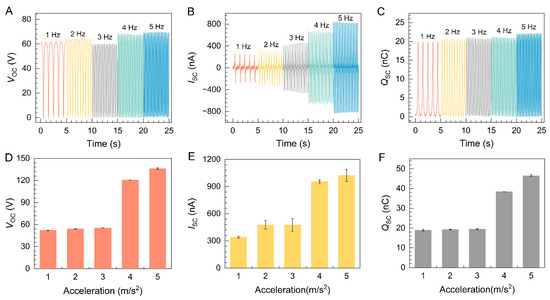 (A–C) Effect of the loading frequencies (1–5 Hz) on the electrical output performance of the pH-TENG, including VOC, ISC, and QSC. (D–F) Effect of the acceleration on the electrical output performance of the pH-TENG, including VOC, ISC, and QSC.