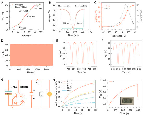 To ensure a consistent output performance, a linear motor was utilized to apply pressure, with a pressure tester affixed at the contact point of the motor. While monitoring voltage signals and applied pressure, the pressure tester’s probe made direct contact with the pH-TENG. The curve in Figure 4A illustrates the relationship between the output voltage and the varying levels of applied pressure. At the initial pressure setting, the recorded voltage output was 28 V. Subsequent increases in external force yielded a gradual rise in output voltage, transitioning into a linear progression, culminating in a steady-state condition. As external force was incrementally augmented from 0 N to 100 N, the pH-TENG’s output voltage similarly ascended, surging from 28 V to 103 V before plateauing. This phenomenon can be attributed to the amplification of contact quality and the expansion of the effective contact surface area between the two contact layers as external force intensifies, subsequently augmenting the electrical output performance [49].