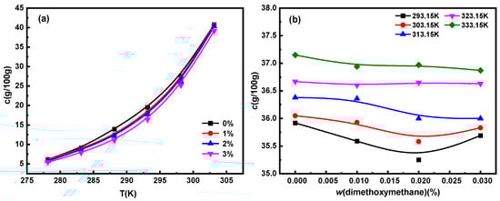 At the same temperature, with an increase in dimethoxymethane concentration, the solubility of Na2SO4 decreased significantly, while that of NaCl first decreased and then increased. As a whole, dimethoxymethane inhibited the dissolution of Na2SO4 and NaCl. When Na2SO4 and NaCl were dissolved in water, Cl−, SO42−, and Na+ were ionized, forming three unstable hydrated ions by binding water molecules through intermolecular forces and electrostatic interactions [26]. The ether group –O– in the structure of dimethoxymethane is a hydrophilic group [27], which could have competed with hydrated ions for water molecules in the solvent, thereby reducing the solubility of Na2SO4 and NaCl. The slightly increased solubility of NaCl at 3% dimethoxymethane might have been caused by the interaction between NaCl and Na2SO4.