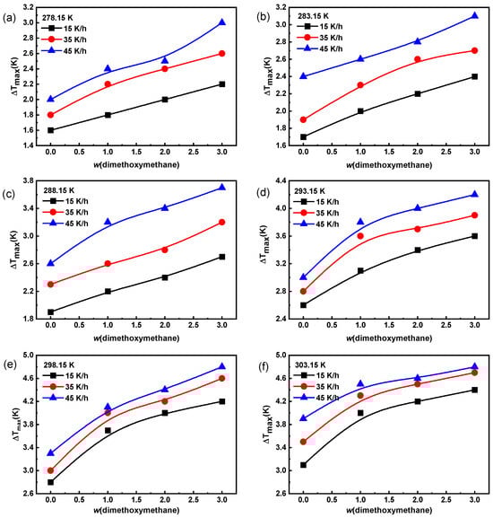 The effect of dimethoxymethane on the metastable zone width of Na2SO4 in water with different cooling rates at saturation temperatures: (a) 278.15 K; (b) 283.15 K; (c) 288.15 K; (d) 293.15 K; (e) 298.15 K; and (f) 303.15 K.