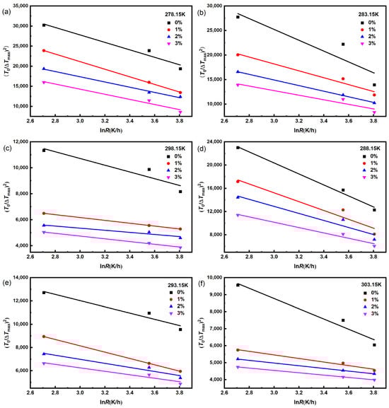 The fitting curves of (T0/ΔTmax)2 and ln R of Na2SO4 at different dimethoxymethane concentrations by using Classical 3D nucleation theory model with different saturation temperatures: (a) 278.15 K; (b) 283.15 K; (c) 288.15 K; (d) 293.15 K; (e) 298.15 K; and (f) 303.15 K.