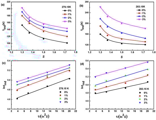 Effect of dimethoxymethane concentration and supersaturation on induction period of Na2SO4 and the fitting results of induction period data based on classical nucleation theory at different saturation temperatures: (a,c) 278.15 K and (b,d) 283.15 K.