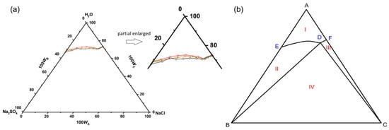 Determination of phase equilibrium data. With the saturated solution of one salt as the initial solution, a series of pseudo-ternary system solutions were prepared by adding another new salt with gradient concentrations [38]. The simulated wastewater solution with different ratios was placed in a constant-temperature oscillation box, oscillating for 9 h and standing for 1 h. The supernatant was then taken and filtered for the measurements of SO42−, Cl−, and the liquid density. The solid was rapidly filtered, and the morphology of the crystal was observed by a metallographic digital microscope.
