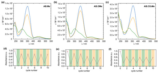 Absorption spectra of AB.Me (a), AB.OMe (b), and AB.CO2Me (c) in tetrahydrofuran (THF) solution; E isomer (blue), Z isomer (green), and photostationary state PSS450 nm (orange). Measured absorbance at λmax for AB.Me (d), AB.OMe (e), and AB.CO2Me (f) in THF solutions by alternately irradiating the sample at λ = 365 nm (green) and λ = 450 nm (orange) in repeated switching cycles.