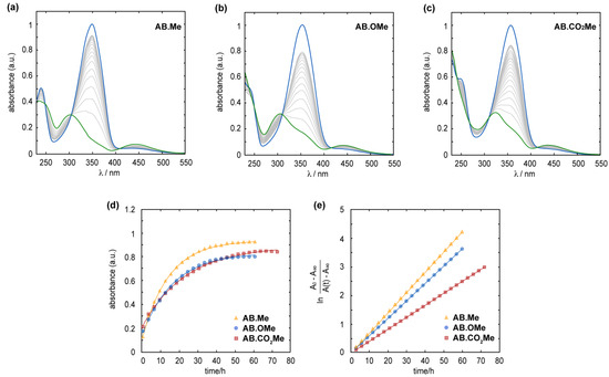Measured absorption spectra for the Z (blue line) to E (green line) thermal relaxation of AB.Me (a), AB.OMe (b), and AB.CO2Me (c) in diluted THF solutions at 25 °C. Measured absorbance at λmax for AB.Me (yellow triangle), AB.OMe (blue circle), and AB.CO2Me (red square) in THF solutions over time; a logarithmic fit (d) and a linear fit were used to estimate relaxation rate constants (e).
