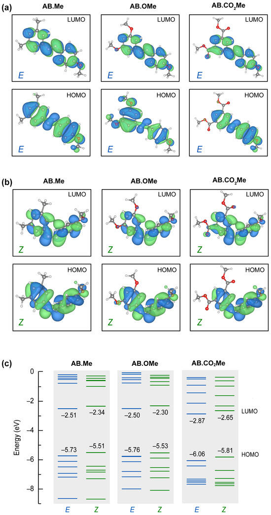 Calculated molecular orbitals HOMO and LUMO for all the E (a) and Z (b) isomers studied in this work, and corresponding energy levels (c).