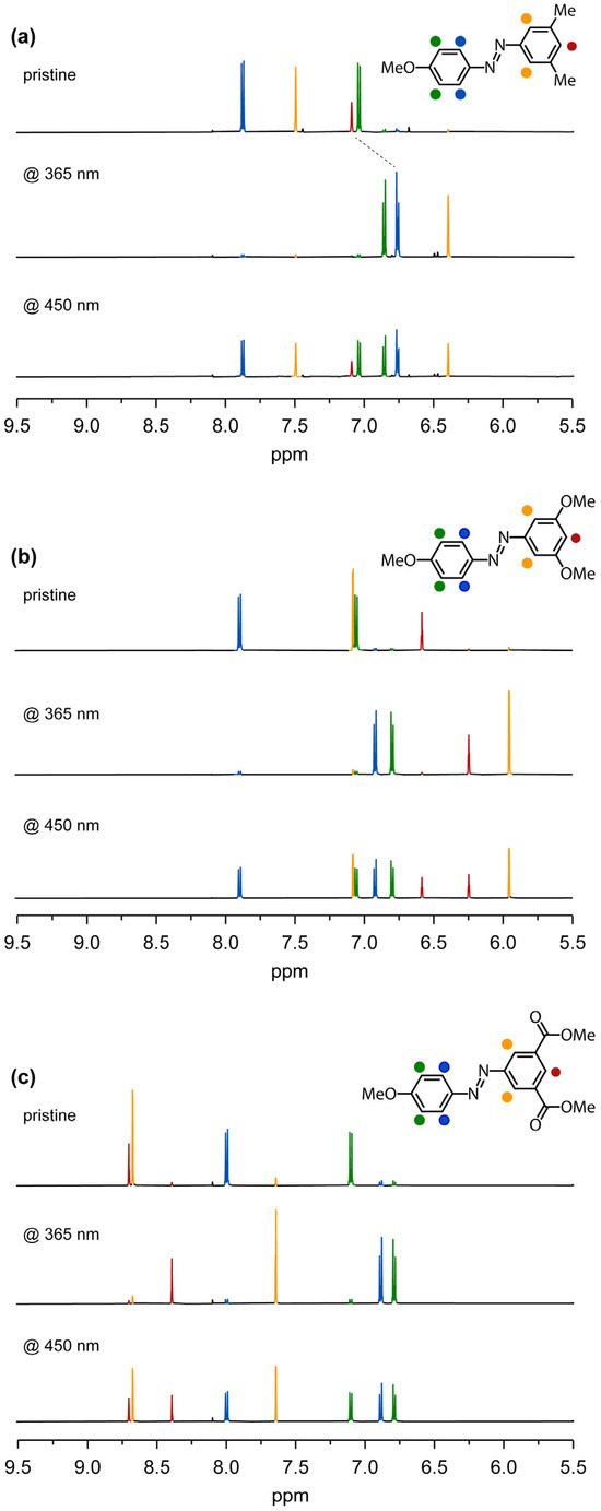 Finally, to assess the amount of E and Z isomers generated after photoexcitation at both 365 nm and 450 nm, we utilized nuclear magnetic resonance spectroscopy. Pristine E isomers display distinct spectral signatures. A comparison of the 1H-NMR spectral profiles of AB.OMe and AB.CO2Me with that of the reference compound AB.Me in Figure 5 reveals a significant displacement of the aromatic proton peaks within the meta-substituted benzene ring.