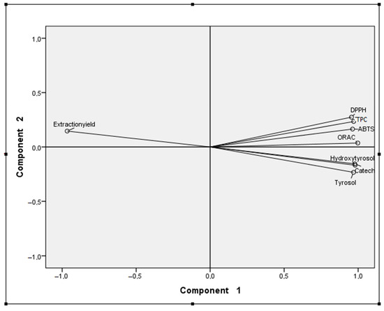 The principal component analysis enables us to summarize, clarify, and simplify a group of information given by the variables. In this case, the different extraction experiments were used as independent variables. The yield of extraction, TPC, and antioxidant activity (ABTS, DPPH, and ORAC) and the concentrations of hydroxytyrosol, tyrosol, and catechol in the extracts were the dependent variables. Maintaining the original variation among extraction experiments, PCA allowed us to make a graphical representation of distance among the different extraction experiments and to identify similar groups or a better extraction methodology for one specific variable (Figure 4 and Figure 5).