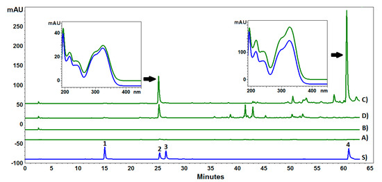 HPLC-PDA chromatograms of methanolic extract fractions from Carlina acaulis root (A–D) and a mixture of reference standards (S): 1—neochlorogenic acid, 2—chlorogenic acid, 3—cryptochlorogenic acid, 4—3,5-di-caffeoylquinic acid.