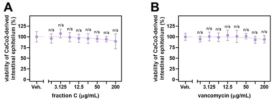 Viability of human enterocytes-based monolayer obtained through differentiation of CaCo2 cells upon 24 h exposure to fraction C (A) or vancomycin (B). Error bars represent standard deviation. The statistical analysis involved Brown–Forsythe ANOVA with Dunnett’s T3 post hoc test. n/s, not significant vs. vehicle control. A four-parameter dose–response curve was fitted to the experimental data points; however, it was not possible to determine the inhibitory concentration causing a half-maximal drop in cellular viability (IC50).