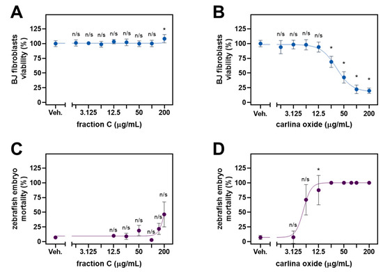 Viability of normal human BJ fibroblasts and zebrafish embryos treated with fraction C or carlina oxide (COx). The BJ cells were exposed to either fraction C (A) or COx (B) for 24 h, and the fitness of the cells was assessed by the MTT assay. Ecotoxic activity was assessed in zebrafish embryos developing in the presence of either fraction C (C) or COx (D) for 96 h. Error bars represent standard deviation. The statistical analysis involved Brown–Forsythe ANOVA with Dunnett’s T3 post hoc test. n/s, not significant vs. vehicle control; * p < 0.05.