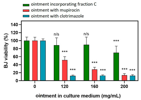 Effect of ointment incorporating fraction C (green bars) or with mupirocin (red bars) on the viability of BJ fibroblasts. Statistical analysis: two-way ANOVA followed by Tukey’s multiple comparisons test. n/s, not significant vs. respective vehicle control; *** p < 0.001.