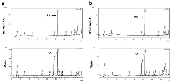 The RA content in all fractions was determined using HPLC (Agilent Technologies, Inc., Santa Clara, CA, USA) [23]. The HPLC system was equipped with a C18-EPS Rocket column (53 mm × 7 mm, GRACE). The mobile phase contained a mixture of 0.1% trifluoroacetic acid and acetonitrile with the flow rate set at 1.0 mL/min. The RA was detected at a wavelength of 280 nm.